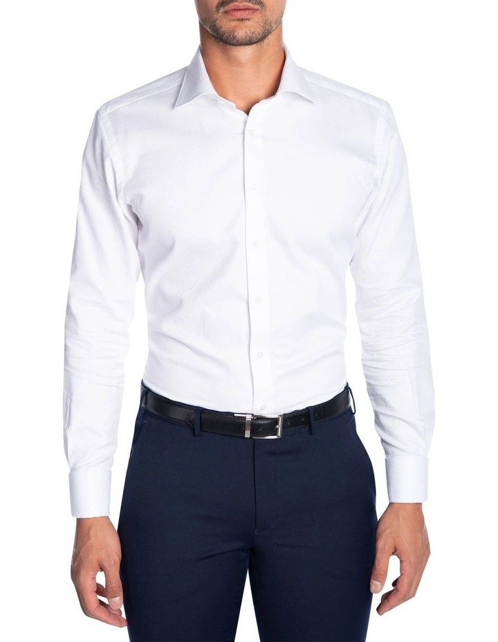 This textured white French cuff cotton shirt is an elegant wardrobe staple. It is cut for a tailored fit from 100% cotton. It is perfect for the office, formal events or smart weekend looks.