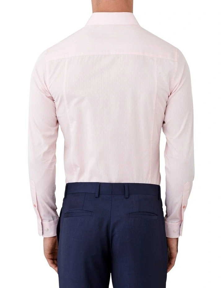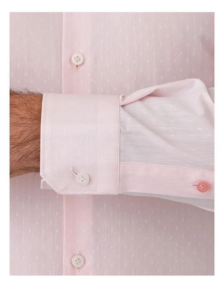 A slim fit shirt in lightweight dobby spot cotton fabric. Available in classic white, chambray and pink. All colours pair back with black, navy & grey suits for that perfect office ensemble. Features contrast details inside the cuff and collar.