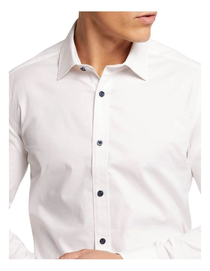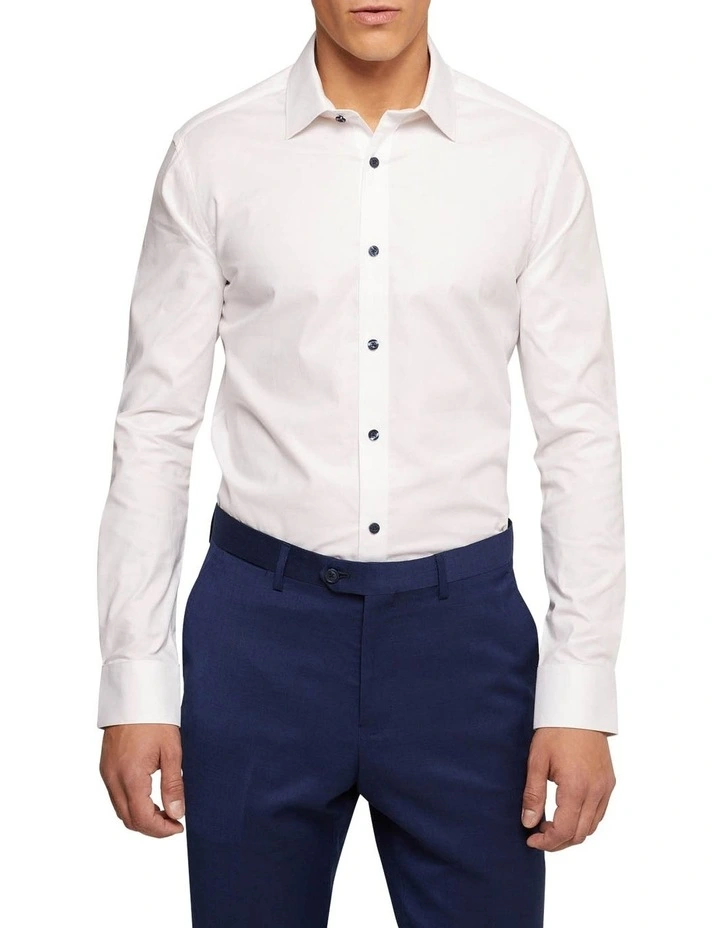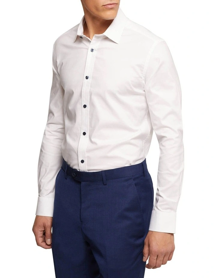 The Beckton Cotton Spandex Shirt is a timeless style for mens business wear. This dependable shirt is crafted from a comfortable organic cotton stretch blend and is cut in a modern slim fit. It has contrast front buttons, a regular collar and single button cuffs, This versatile shirt will look great with any suiting style. Try a navy suit for a more traditional feel or a patterned suit for a touch of flair.