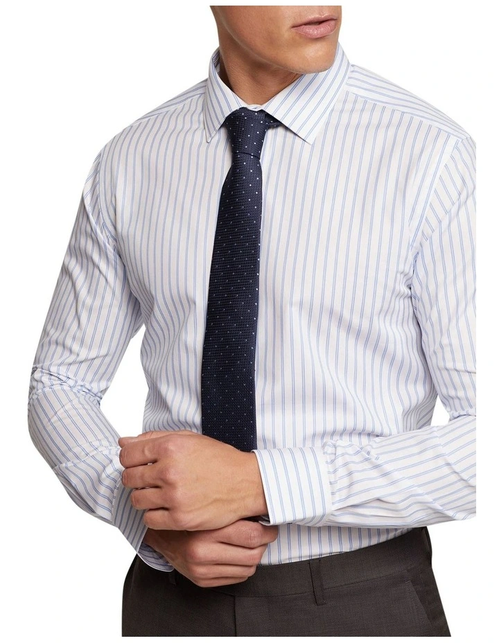 Up the ante at the office in the Beckton Slim Fit Striped Shirt. Thisstylish work shirt is cut in a slim fit and is crafted from 100% organic cotton. It features a vertical stripe pattern,a small collar and single button cuffs. Wear it with a charcoal suit and brown leather accessories for a dapper look at the office.